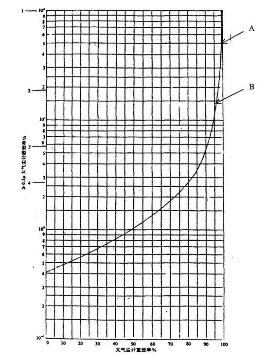 注:表中效率均是大气尘分组计数效率(大气尘分组计数效率是指以大气尘为尘源,按≥0.3μm、≥0.5μm、≥O.7μm、≥l.0μm、≥2.0μm和≥5.0μm分组对过滤器进行计数效率的测定)。当大气尘分组计数效率测定结果同时满足表中两个类别时,按低类别评定。 GB 12218-89 中规定I、II型过滤器效率亦可用人工尘计重法测试。